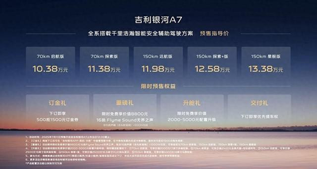 吉利银河A7以10.38万-13.38万元的预售价格正式入局,这款被定义为"全球家轿新标杆"的插混车型,凭借2.67L/100km超低馈电油耗、2100km CLTC综合续航以及限时2000-5000元配置升级权益,在家轿市场投下一颗"技术重磅"。