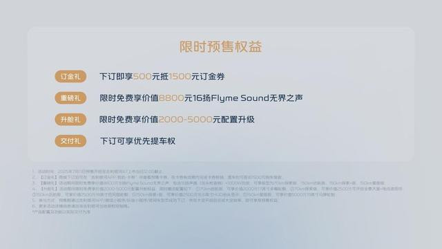 预售权益更显诚意:用户下订可限时免费升级2000-5000元配置。具体来看,70km启航版升级17英寸多辐轮毂;70km探索版加装全景天窗电动遮阳帘;150km远航版换装18英寸低风阻轮毂;150km探索版增配16.6英寸HUD抬头显示;顶配150km星舰版直接升级19英寸马牌轮胎。此外,500元抵1500元订金券、价值8800元的16扬声器Flyme Sound无界之声音响等权益,进一步强化性价比标签。